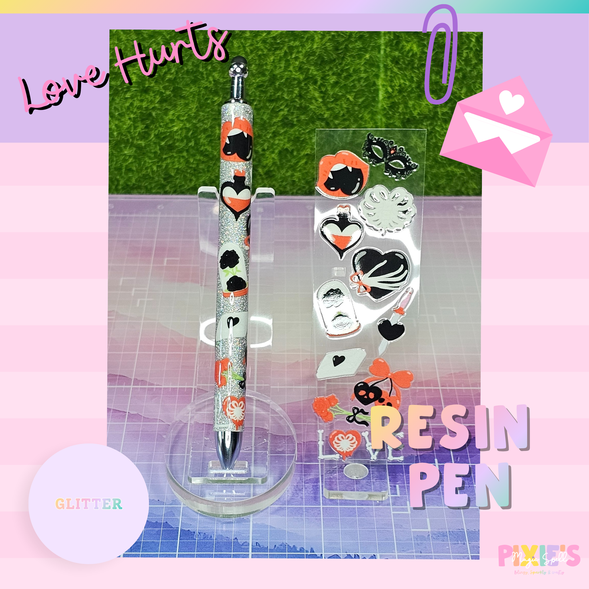 • Handmade resin pen with glitter details